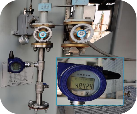 無線油壓在線監測裝置安裝于儲油柜注放油管出口閥門處,用以監測該位置油壓大小及油壓變化情況,根據該壓強值及油溫值可推算變壓器當前實際油位,有效彌補傳統油位計因“假油位”(自身故障、膠囊破損、呼吸不暢等)導致油位無法準確監測的短板,及時發現油位異常,避免因油位過低或緩慢漏油造成變壓器跳閘(雙浮球瓦斯繼電器)甚至絕緣損壞的問題,以及油位過高造成壓力釋放動作、變壓器跳閘的問題 。