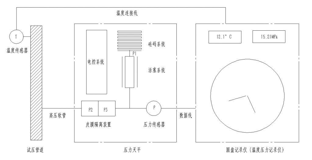 壓力天平相當于液體天平,一邊是砝碼重力所產生的壓力,一邊是液體管道內的壓力,當這二個壓力相等時二者是平衡的(檢測管道內壓力具體值,砝碼值之和即為管道內壓力值),當管道出現微泄這個平衡就會被打斷(檢測管道是否存在微泄)。